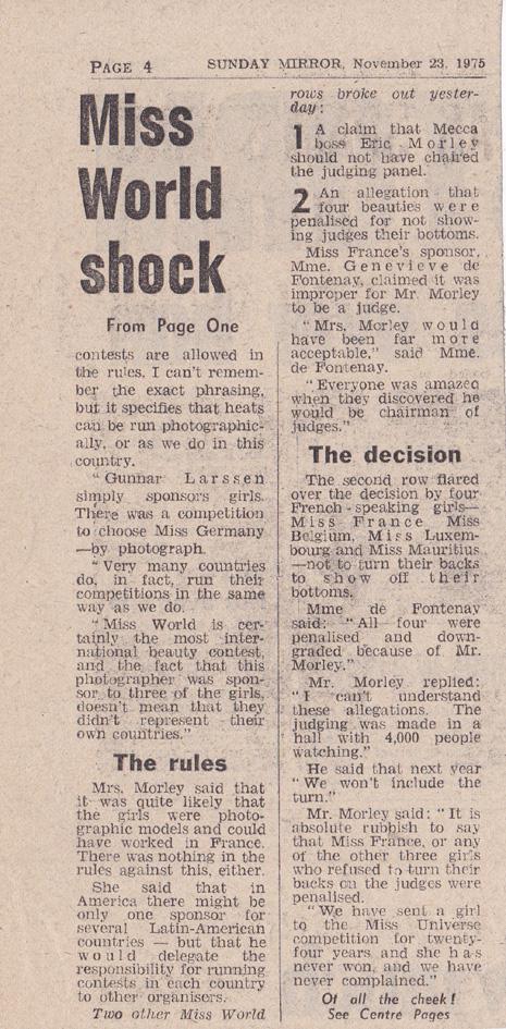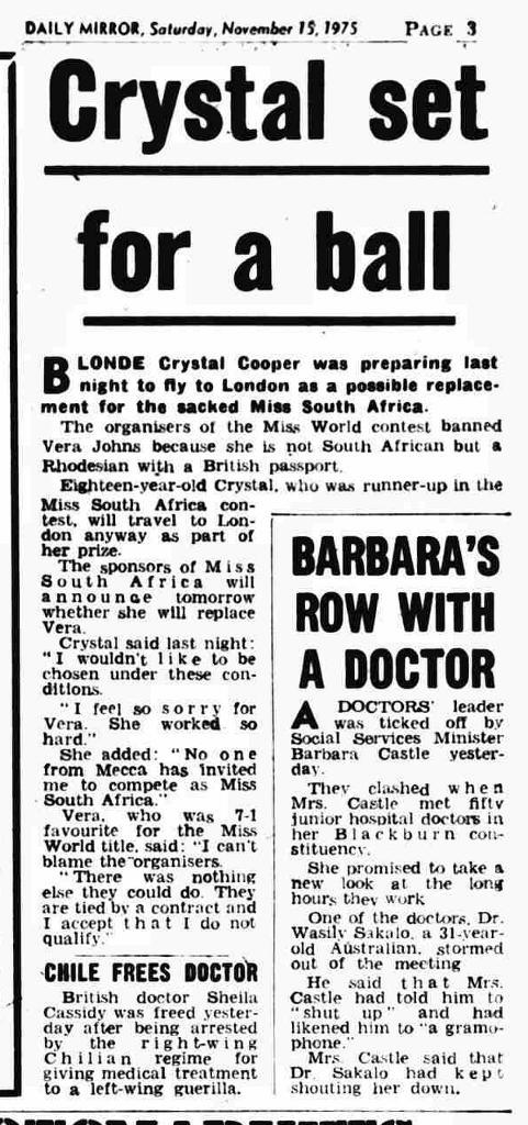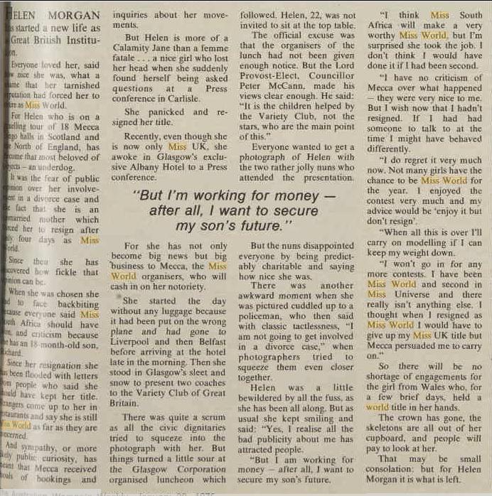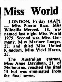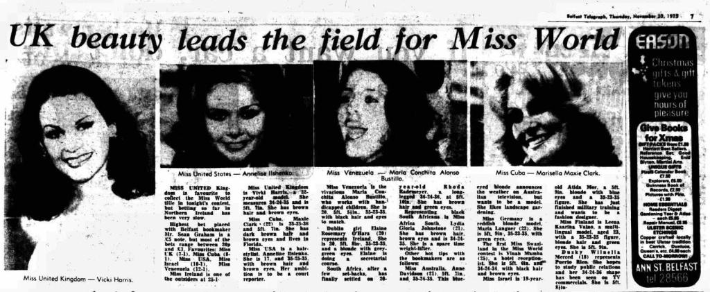 – Miss United Kingdom.- Vicki Harris, Miss England and a Miss Universe 1975 semifinalist, born in Malaysia, won the crown of “Miss United Kingdom” on Tuesday August 19 in Blackpool, with 35 candidates, being crowned by Helen Morgan. Sue Cuff and Gail Inglis were the finalists.
