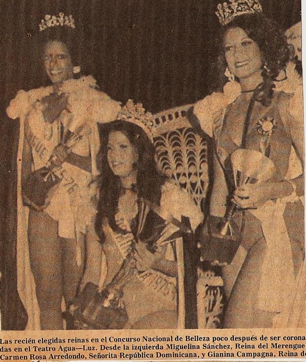 – National Beauty Contest (Dominican Republic) .- Held on April 30 at the Agua-Luz theater in Santo Domingo. The winner, as Miss Dominican Republic, was Carmen Rosa Arredondo, who went to Miss World. The Queen of Tourism was Gianina Campagna and the Queen of Merengue, Miguelina Sánchez.