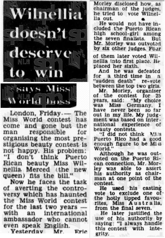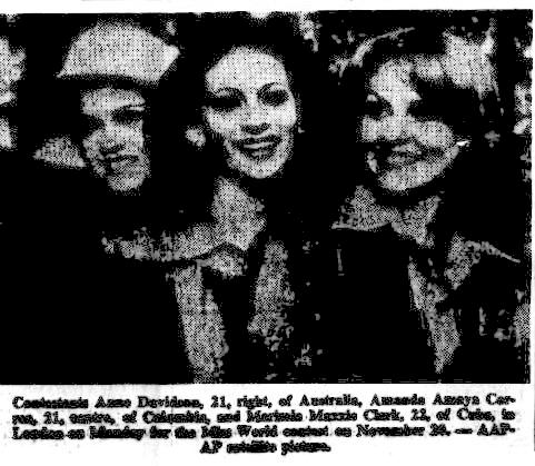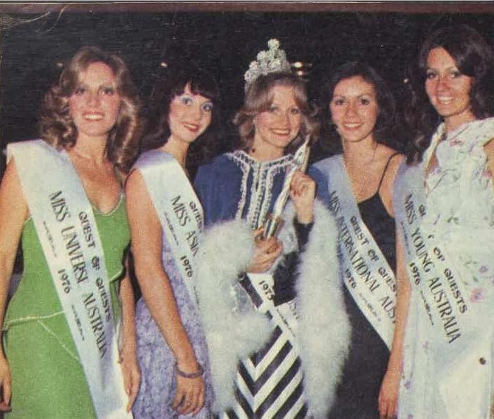 – Quest of Quests.- Anne Davidson won the title of “Australia´s Dream Girl” at the Quest of Quests held on Wednesday September 10 at the Wentworth Hotel in Sydney among 12 candidates. Anne was also chosen Miss World Australia. Other winners were Julie Ismay (to Miss Universe), Patricia Newell (to Miss International), Michelle Glass (to Miss Asia Pacific) and Karen James (to Miss Young International).