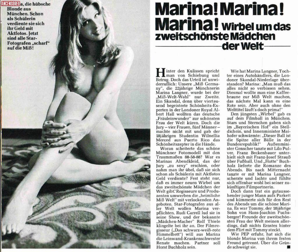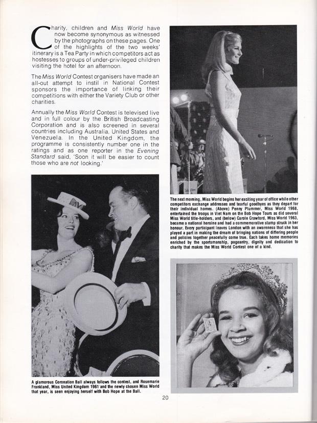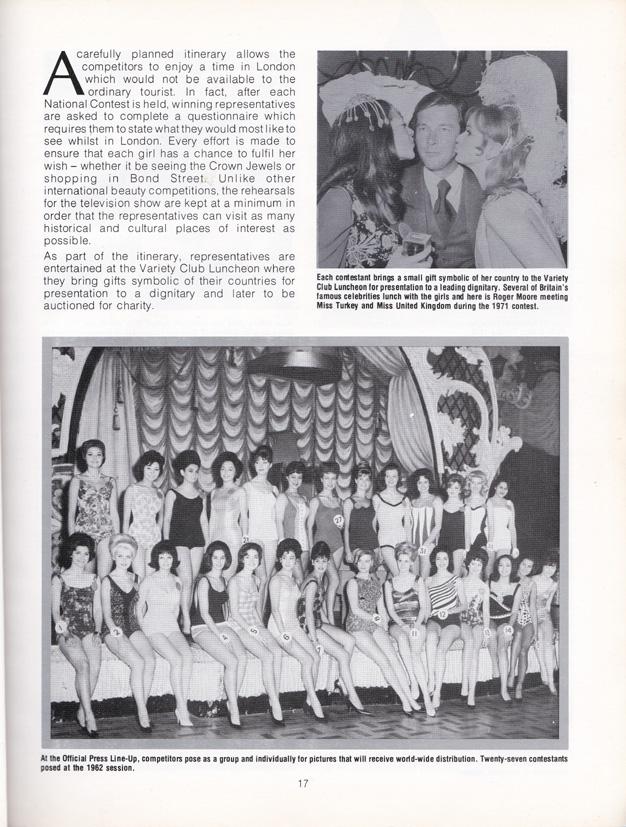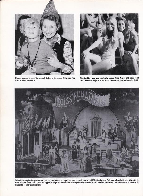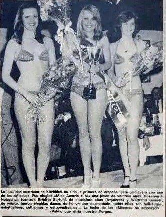 – Miss Austria.- Beginning in spring, Miss Austria was held in the city of Kitzbuhel, and Rosemarie Holzschuh, 21, was chosen. She represented her country in both Miss Universe and Miss World. The finalists were Brigitte Bertold and Waltraud Gasser.