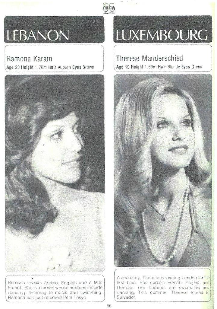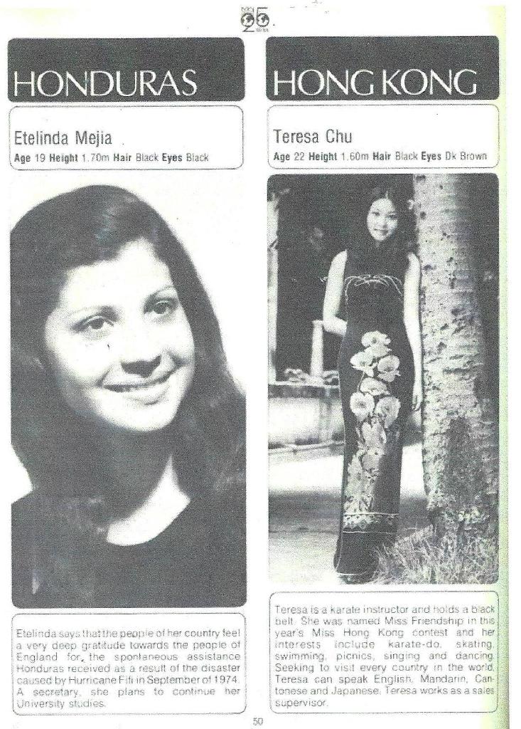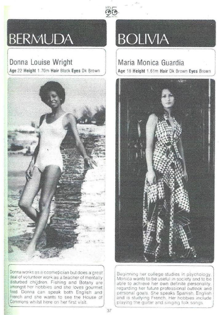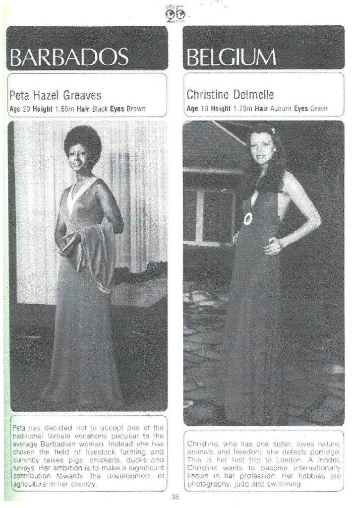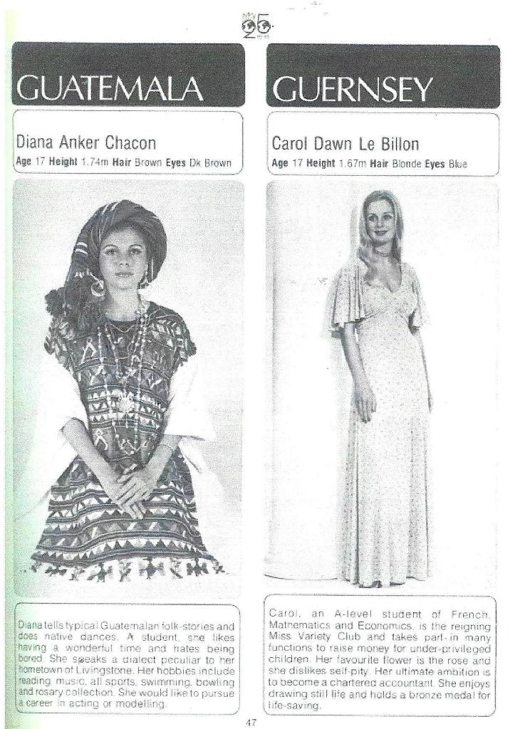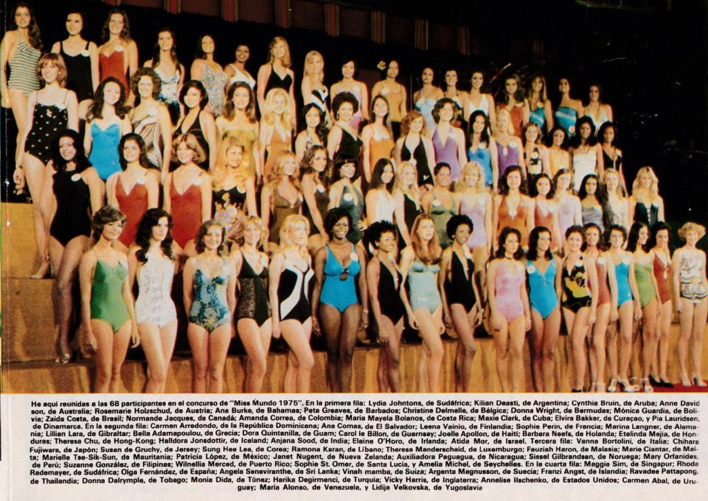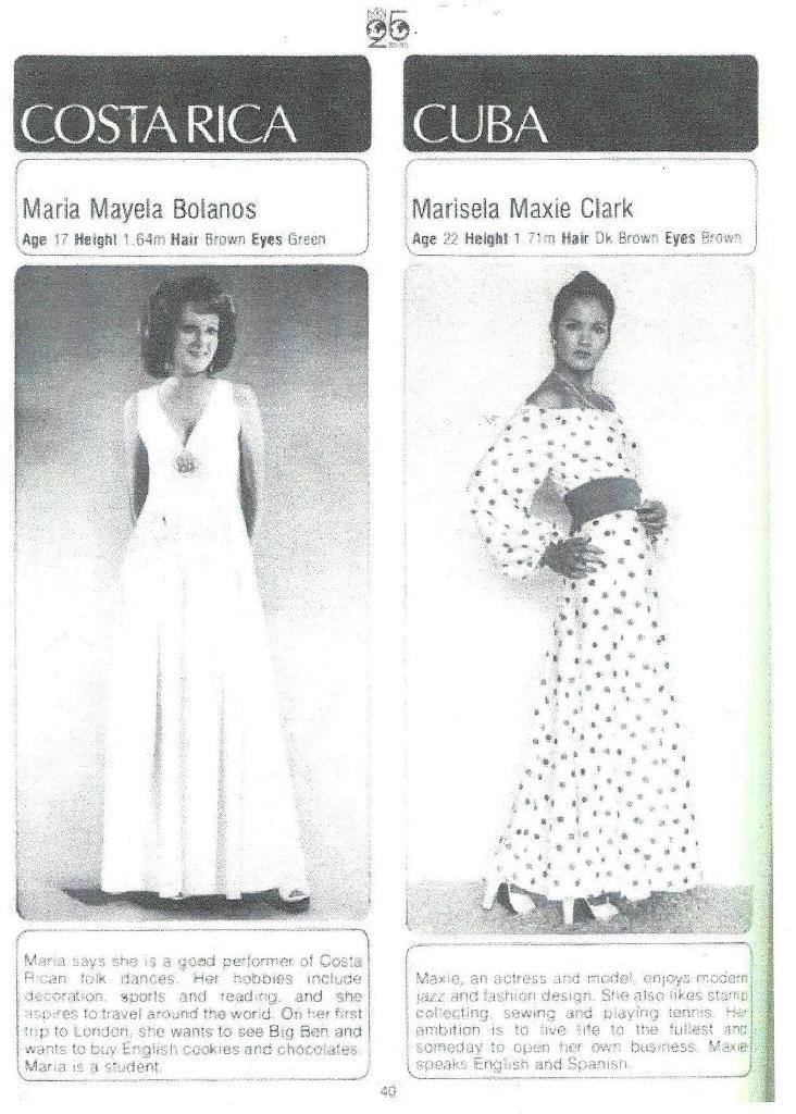 Two African countries, Botswana and Liberia, had sponsor problems and, although they chose their beauty queens, they announced in early November that they would not be represented in Miss World this year. In Jamaica, the Ministry of Culture took the reins of the contest, wanting to give the contest another focus, with cultural awareness, talent and community development as a priority, so there were certain disagreements among the previous organizers. The contest was then organized by the Festival Committee, appointed by the Ministry, changing the name of the event to the ” Jamaica’s Festival Queen”. Initially, the winner, Lydia Alethia Malcolm, would go to Miss World, but the rights to the contest on the island were still in the hands of the previous managers, so their participation was not confirmed. Miss Malcolm traveled to London with the air ticket obtained as part of her awards and stayed there. When she did not return to Jamaica, the title was conferred on the first runner-up, Pamela Alvaranga. However, the contest was canceled the following year because they no longer had the rights to Miss World and it was not held again until 1985. Miss Honduras was not held in 1975 because Miss Universe would be held in El Salvador and both countries did not maintain relations due to war. But the organizer, Norma de Funes, sent the 1974 titleholder, Etelinda Mejía, to London. A total of 73 countries were confirmed for the worldwide contest until the date the program book was sent to the press on the second week of November. Among the other countries that held their national competitions we have the following: