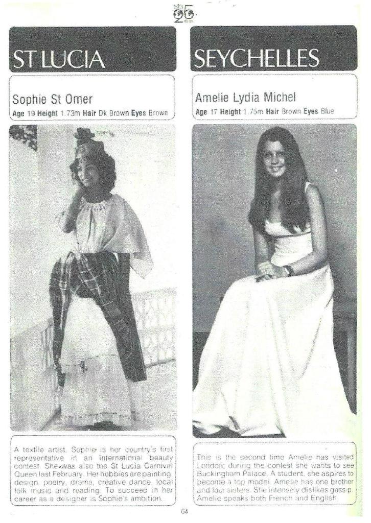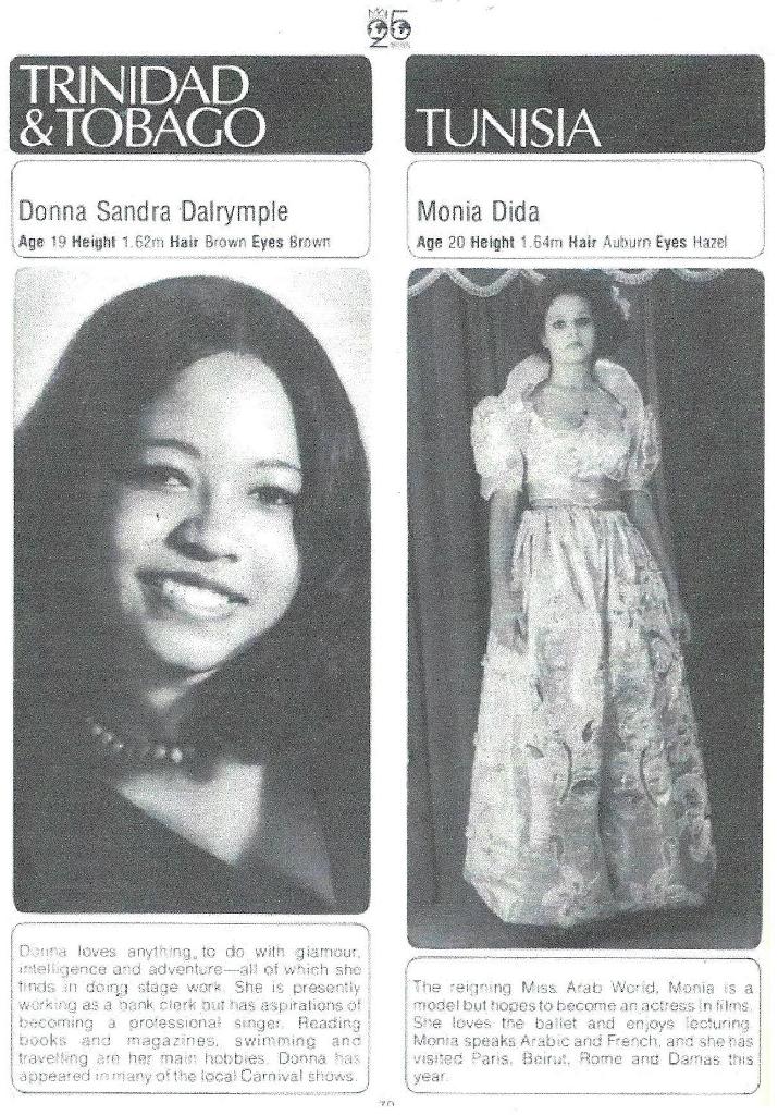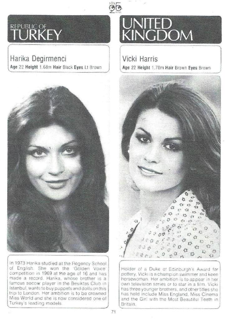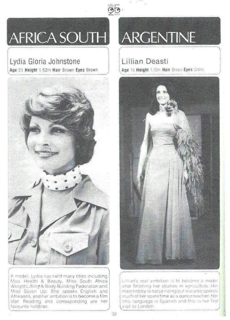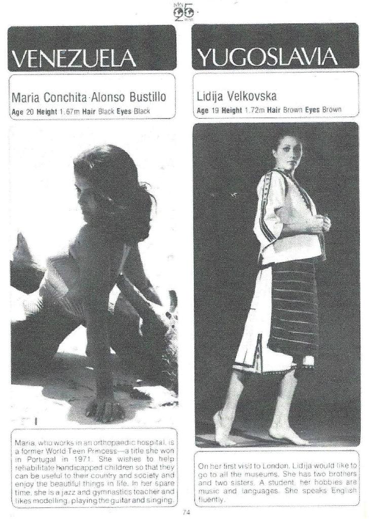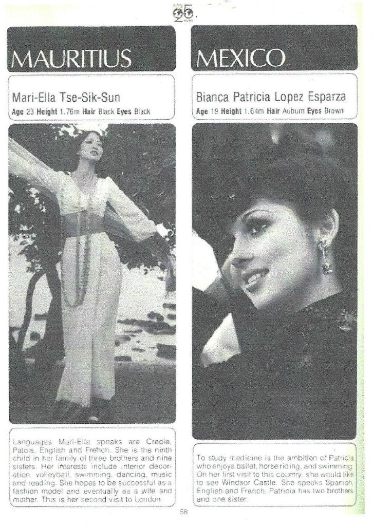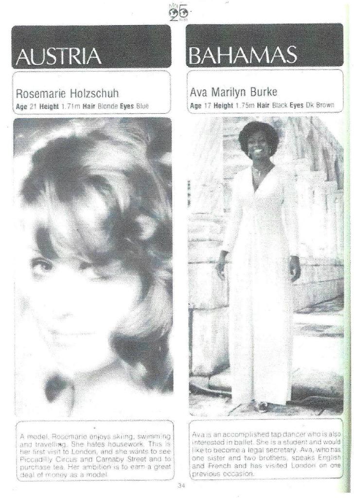 Two African countries, Botswana and Liberia, had sponsor problems and, although they chose their beauty queens, they announced in early November that they would not be represented in Miss World this year. In Jamaica, the Ministry of Culture took the reins of the contest, wanting to give the contest another focus, with cultural awareness, talent and community development as a priority, so there were certain disagreements among the previous organizers. The contest was then organized by the Festival Committee, appointed by the Ministry, changing the name of the event to the ” Jamaica’s Festival Queen”. Initially, the winner, Lydia Alethia Malcolm, would go to Miss World, but the rights to the contest on the island were still in the hands of the previous managers, so their participation was not confirmed. Miss Malcolm traveled to London with the air ticket obtained as part of her awards and stayed there. When she did not return to Jamaica, the title was conferred on the first runner-up, Pamela Alvaranga. However, the contest was canceled the following year because they no longer had the rights to Miss World and it was not held again until 1985. Miss Honduras was not held in 1975 because Miss Universe would be held in El Salvador and both countries did not maintain relations due to war. But the organizer, Norma de Funes, sent the 1974 titleholder, Etelinda Mejía, to London. A total of 73 countries were confirmed for the worldwide contest until the date the program book was sent to the press on the second week of November. Among the other countries that held their national competitions we have the following: