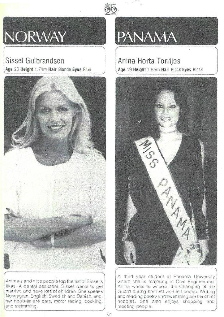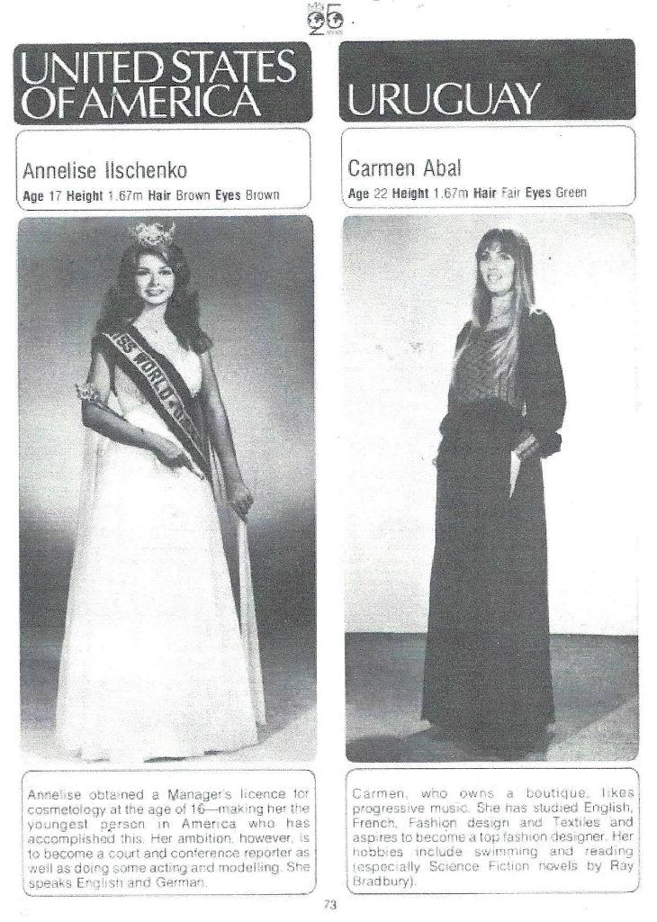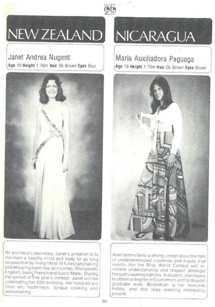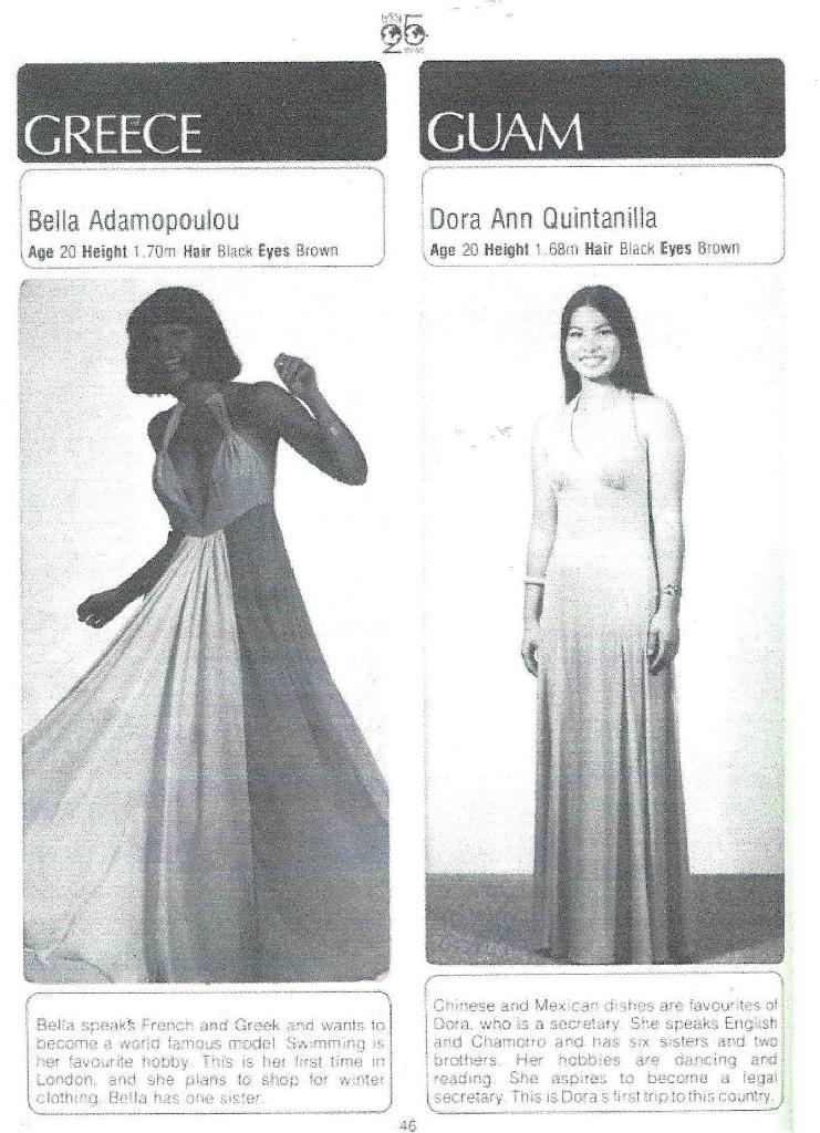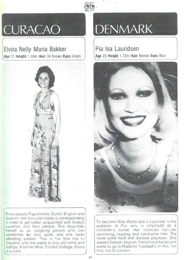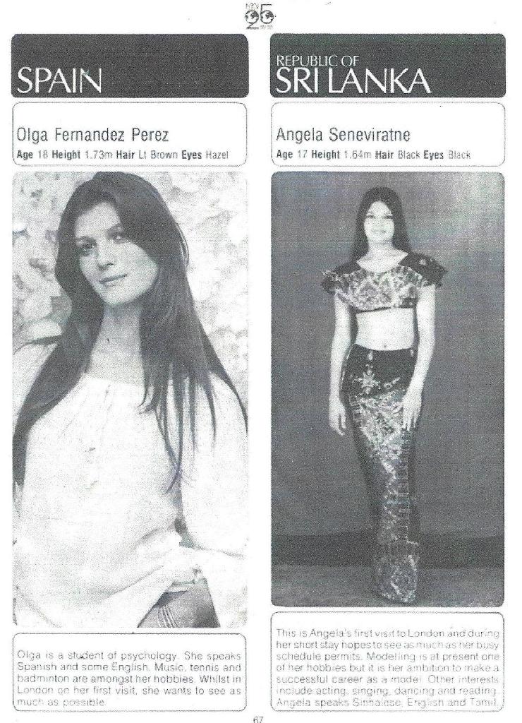 Two African countries, Botswana and Liberia, had sponsor problems and, although they chose their beauty queens, they announced in early November that they would not be represented in Miss World this year. In Jamaica, the Ministry of Culture took the reins of the contest, wanting to give the contest another focus, with cultural awareness, talent and community development as a priority, so there were certain disagreements among the previous organizers. The contest was then organized by the Festival Committee, appointed by the Ministry, changing the name of the event to the ” Jamaica’s Festival Queen”. Initially, the winner, Lydia Alethia Malcolm, would go to Miss World, but the rights to the contest on the island were still in the hands of the previous managers, so their participation was not confirmed. Miss Malcolm traveled to London with the air ticket obtained as part of her awards and stayed there. When she did not return to Jamaica, the title was conferred on the first runner-up, Pamela Alvaranga. However, the contest was canceled the following year because they no longer had the rights to Miss World and it was not held again until 1985. Miss Honduras was not held in 1975 because Miss Universe would be held in El Salvador and both countries did not maintain relations due to war. But the organizer, Norma de Funes, sent the 1974 titleholder, Etelinda Mejía, to London. A total of 73 countries were confirmed for the worldwide contest until the date the program book was sent to the press on the second week of November. Among the other countries that held their national competitions we have the following: