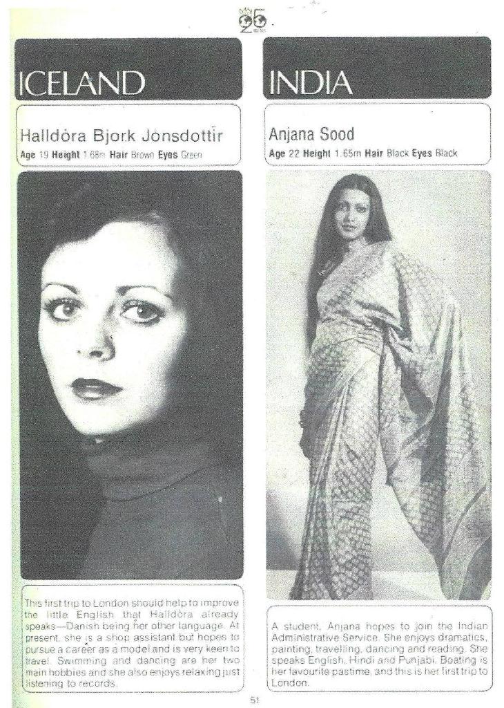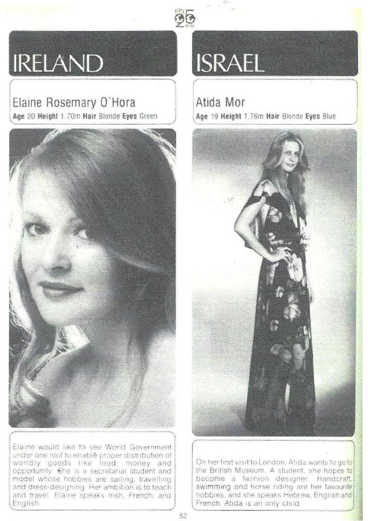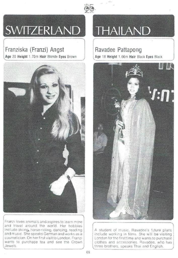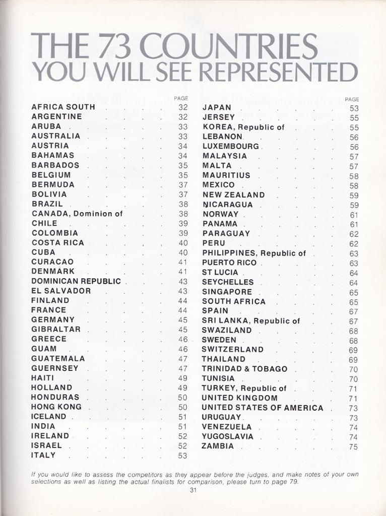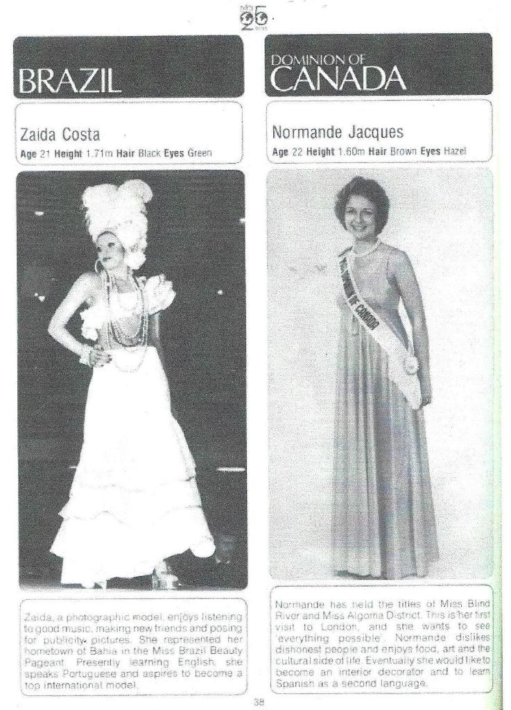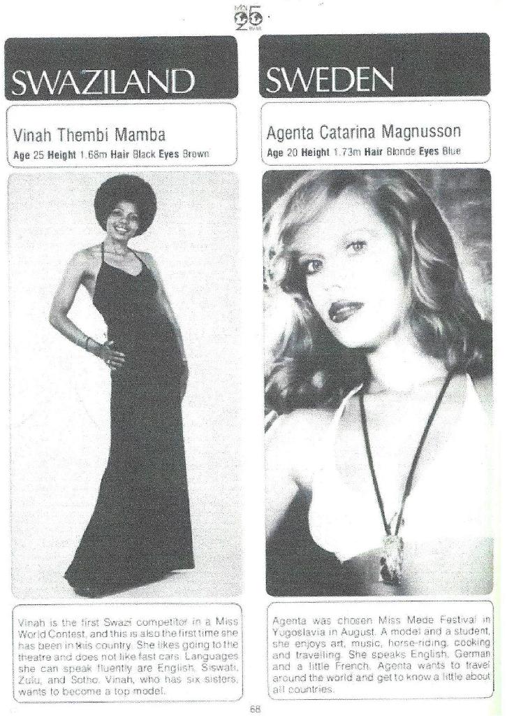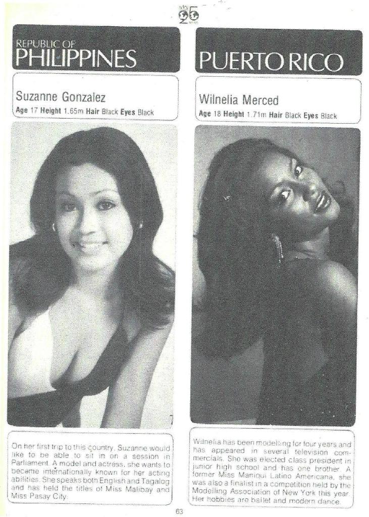 Two African countries, Botswana and Liberia, had sponsor problems and, although they chose their beauty queens, they announced in early November that they would not be represented in Miss World this year. In Jamaica, the Ministry of Culture took the reins of the contest, wanting to give the contest another focus, with cultural awareness, talent and community development as a priority, so there were certain disagreements among the previous organizers. The contest was then organized by the Festival Committee, appointed by the Ministry, changing the name of the event to the ” Jamaica’s Festival Queen”. Initially, the winner, Lydia Alethia Malcolm, would go to Miss World, but the rights to the contest on the island were still in the hands of the previous managers, so their participation was not confirmed. Miss Malcolm traveled to London with the air ticket obtained as part of her awards and stayed there. When she did not return to Jamaica, the title was conferred on the first runner-up, Pamela Alvaranga. However, the contest was canceled the following year because they no longer had the rights to Miss World and it was not held again until 1985. Miss Honduras was not held in 1975 because Miss Universe would be held in El Salvador and both countries did not maintain relations due to war. But the organizer, Norma de Funes, sent the 1974 titleholder, Etelinda Mejía, to London. A total of 73 countries were confirmed for the worldwide contest until the date the program book was sent to the press on the second week of November. Among the other countries that held their national competitions we have the following: