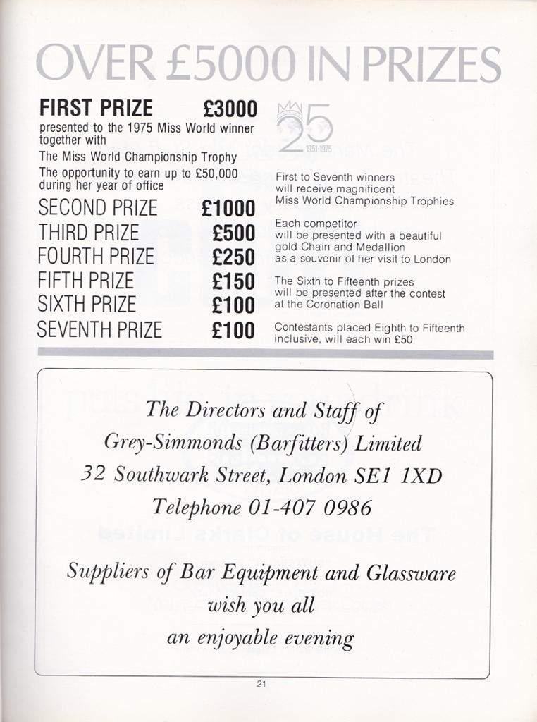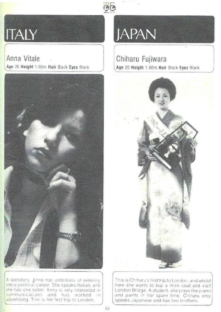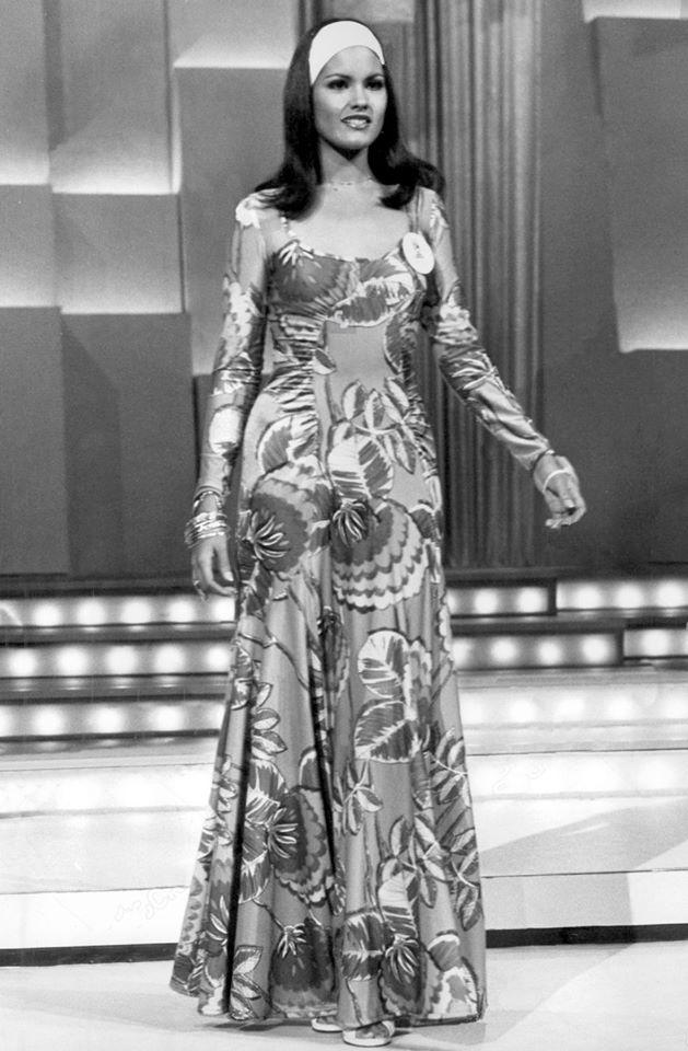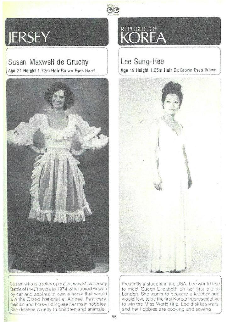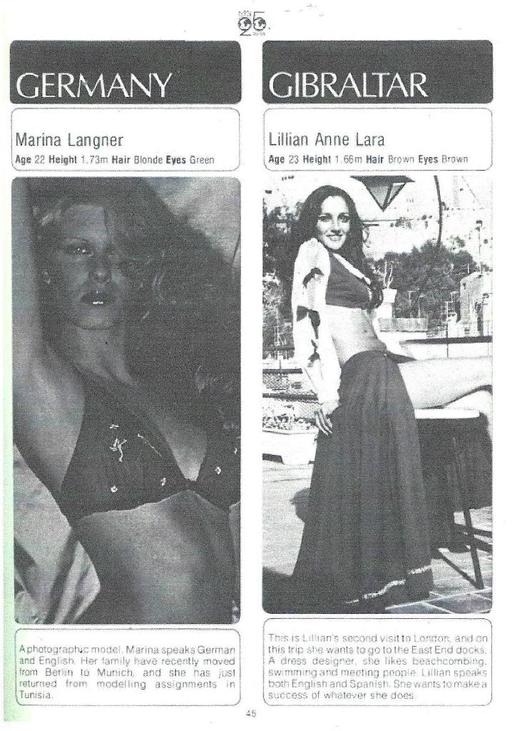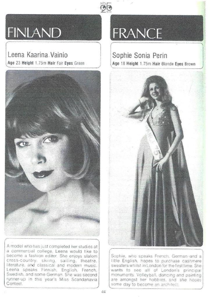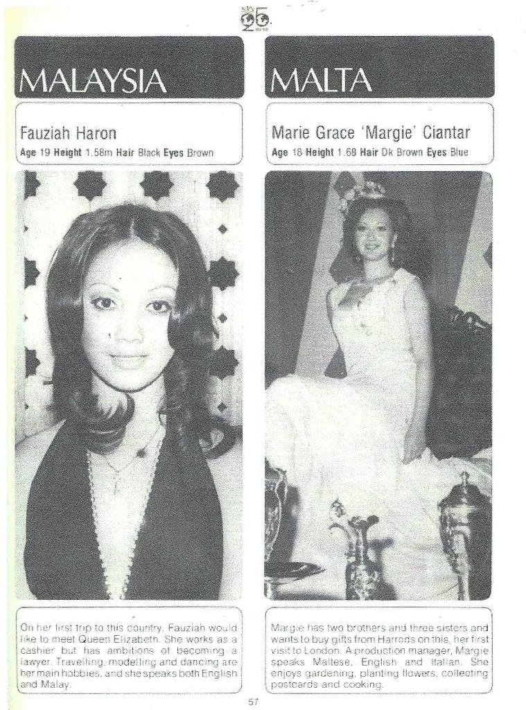 Celebrating the first twenty-five years of a project is the dream of any entrepreneur. This year the “Silver Jubilee” of the Miss World contest was celebrated and the Morleys wanted to push the boat out for it. They invited almost all the queens who had been Miss World and had in mind to produce an opening musical number with all of them. They modified the rules of the contest, prohibiting not only the participation of married women (which had already been in effect for several years) but also those single women who had children. They also modified the residence clause, in which a girl could represent a country only if she had lived in it for the last five years (previously it was only one year). Already the previous year they had modified the crown, adding some rhinestones to the strass straps to make it a little more resistant and, at the same time, flexible, however they made a tender for a new crown. In addition, they sent invitations to more than 80 countries to be part of these celebrations. By 1975, Julia Morley had achieved the record of having directors in 79 countries and territories, who had originally confirmed their participation in the event. However, in Cyprus there was no national contest for the aftermath of the Turkish invasion of the previous year, in Madagascar they did not hold their beauty event either and Ecuador decided to send their queen only to Maja International for financial reasons. Meanwhile, the political situation in Portugal caused the contest to be canceled indefinitely, thus losing the rights to Miss World.