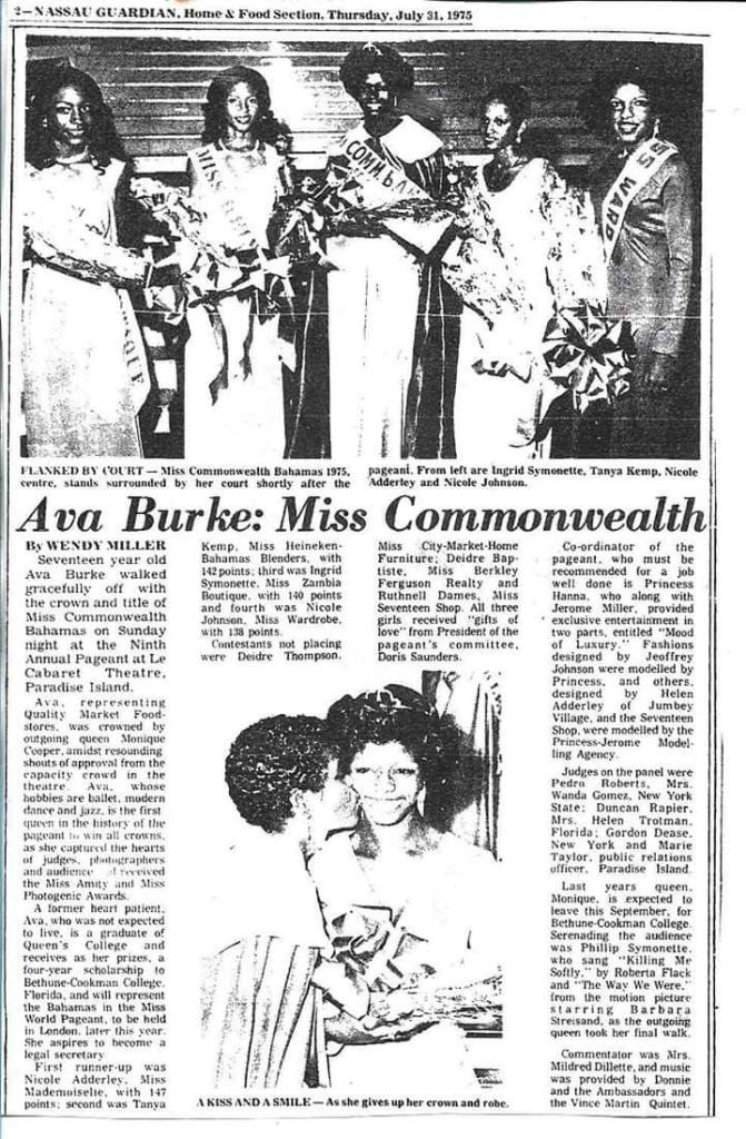 – Miss Commonwealth Bahamas.- 17-year-old Ava Marilyn Burke won the title on Sunday, July 27 at the Le Cabaret Theater in Paradise Island. The finalists were Nicole Adderly, Tanya Kemp, Ingrid Symonette and Nicole Johnson.