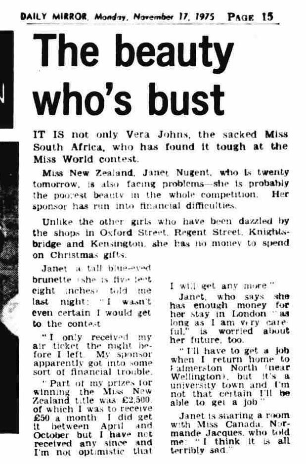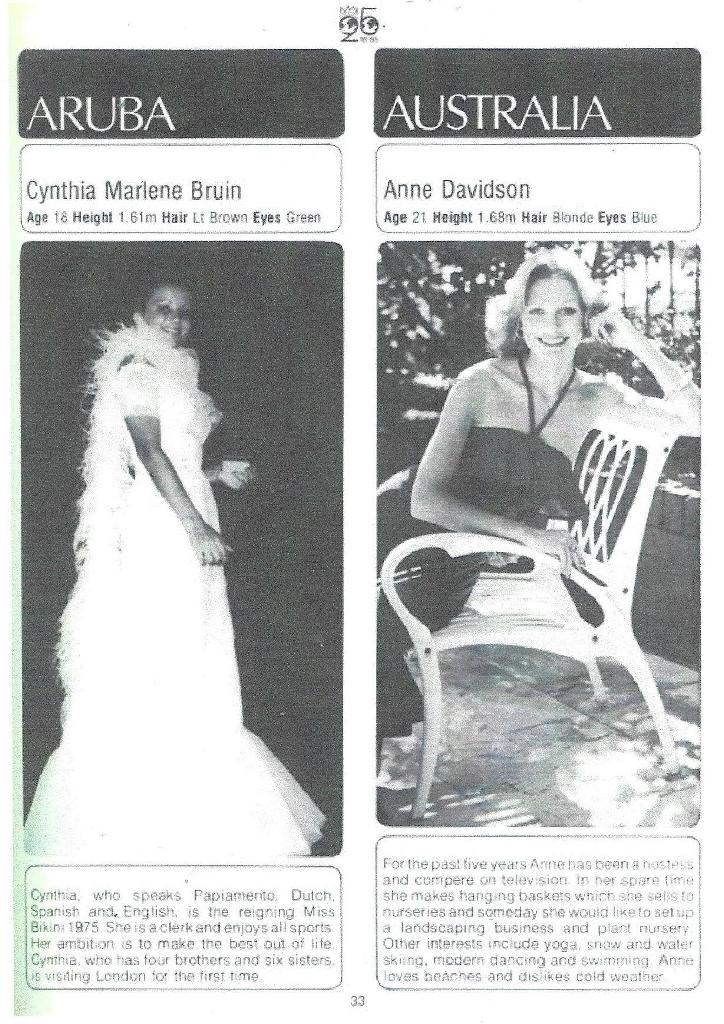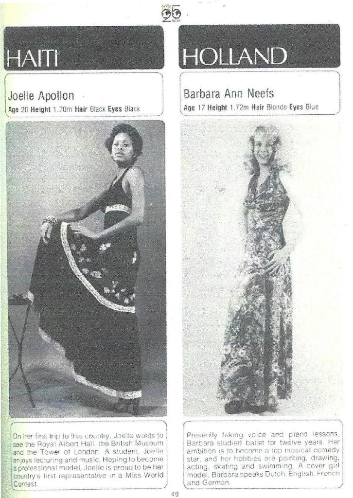 – Miss Holland.- Lynda Snippe, 18, won the “Miss Holland 1975” contest on May 5 at the Kurhaus in Scheveningen. The finalists were Cora Kitz, Barbara Ann Neefs, Nanny Nielen and the main favorite, Ellen Soeters. Following her participation in Miss Universe, Lynda had an impasse with local organizers and was dethroned, with first-place finisher Cora Kitz ascending the throne. Second runner-up, Barbara Neefs, just 17, was sent to Miss World.