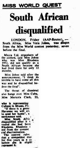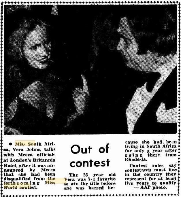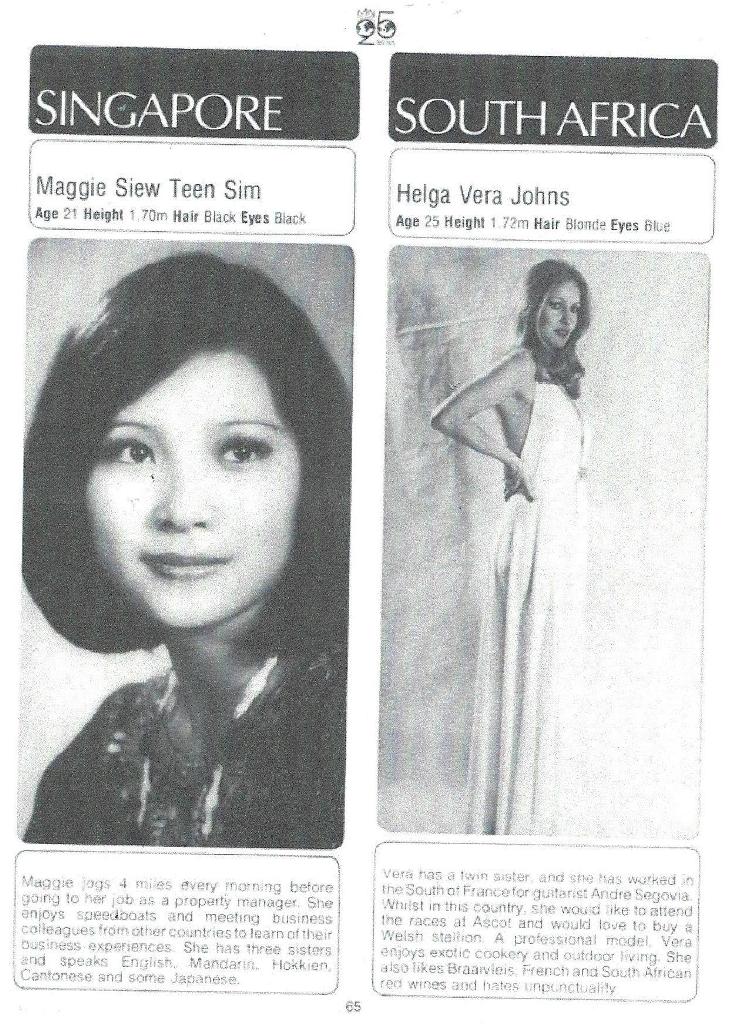 – Miss South Africa.- It was held on Saturday, August 23 at the Civic Theater in Johannesburg. Helga Vera Johns, who had been elected “Miss Rhodesia” in 1972, was crowned “Miss South Africa 1975”. The finalists were Crystal Cooper and Rhoda Rademeyer.