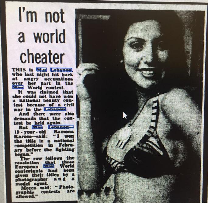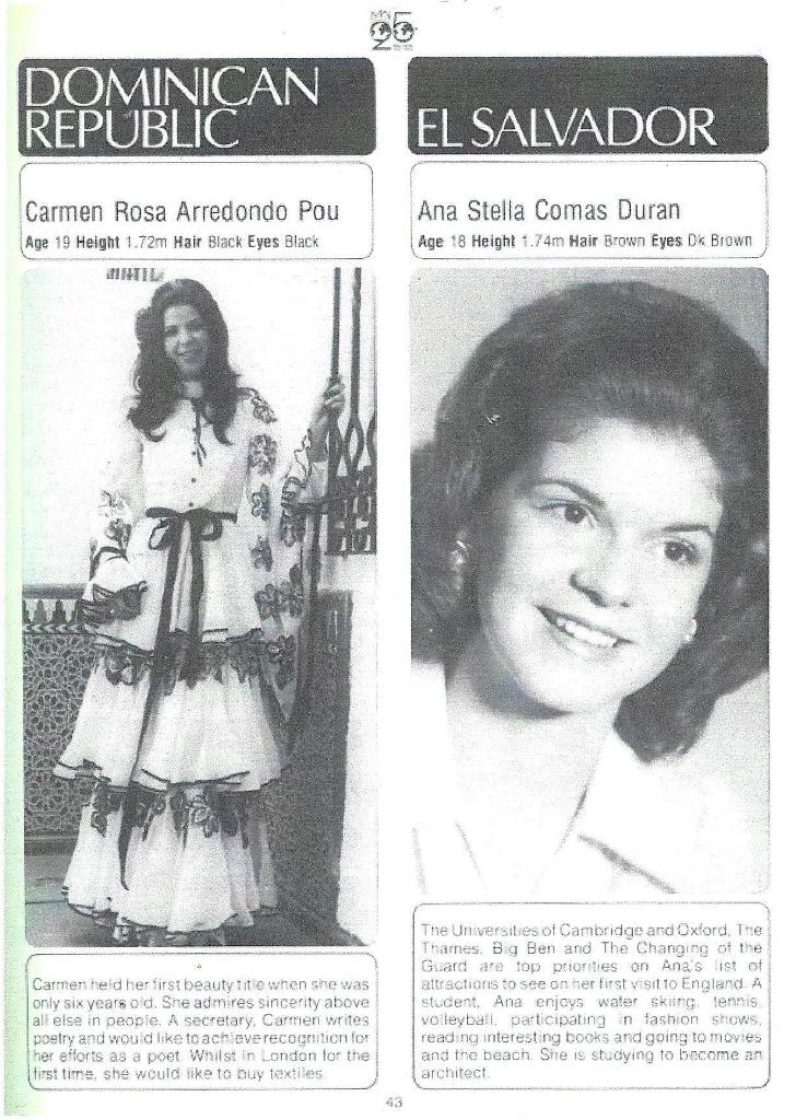 – Miss El Salvador.- On Friday June 6, the first “Miss El Salvador” contest in many years was held. The winner, Carmen Elena Figueroa, would host the Miss Universe pageant because the 1975 edition would be based in the city of San Salvador. Ana Stella Comas Durán, was selected to go to Miss World for the first time in the history of the contest.