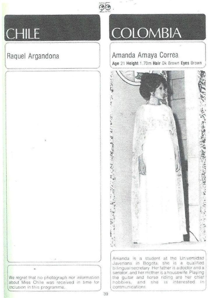 – Miss Colombia.- Mrs. Tera Pizarro de Ángulo, organizer of the Colombian National Beauty Pageant, decided to give more importance to Miss World. This year, it would not be the third but the first princess who would go to London. The contest was held on November 11, 1974 with 13 candidates, and young Martha Lucía Echeverri Trujillo (Miss Valle) was chosen as Miss Colombia (to Miss Universe). The Vice-Queen (to Miss International) was Alina María Botero López (Miss Antioquia) and the First Princess (to Miss World), Amanda Amaya Correa (Miss Guajira).