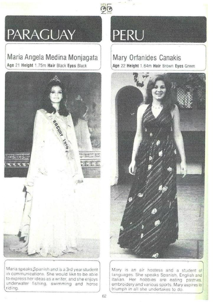 – Girl of the Year (Peru) .- As the military who ran the country considered it an offense to use the nation’s name for a beauty pageant, Gente Magazine organized the “Girl of the Year 1975” pageant on Wednesday June 25 in the Independencia hall of the Sheraton Hotel in Lima with 21 participants. It was the first national contest to be held since 1972. The winner, Lourdes Berninzon, was sent to Miss Universe, and the first runner-up, Mary Orfanides, was designated to go toMiss World. The remaining finalists were Lidia Zolezzi, Aurora Hornung and Pilar Galindo.