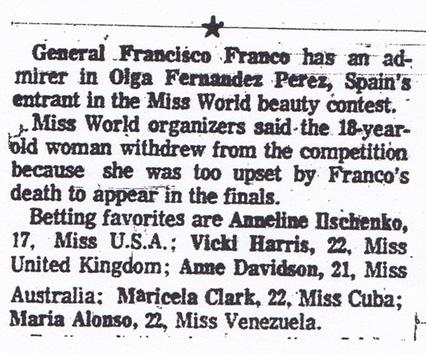 – Miss Spain.- Olga Fernández Pérez, representative of Galicia, was chosen “Miss Spain 1975” at the gala held on Sunday August 31 at a hotel in Playa de las Américas, in the south of Tenerife. The title of Miss National went to Victoria Martín González of Tenerife, who represented Miss Atlántico and, as Maid of Honor, Teresa Maldonado, Miss Catalonia.