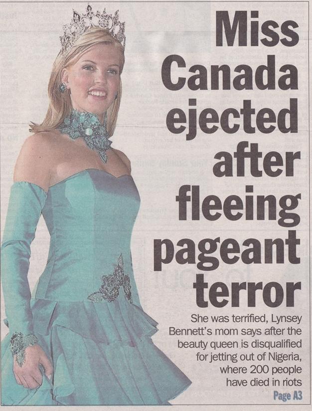 * MISS CANADA INTERNATIONAL.- Miss Ottawa, Lynsey Bennett, defeated 24 other competitors in Mississauga on Saturday, August 24, crowning herself as ‘Miss Canada International 2003’ and winning her pass to Miss World 2002. The first runner-up was Lorenza Sammarelli from Vancouver.