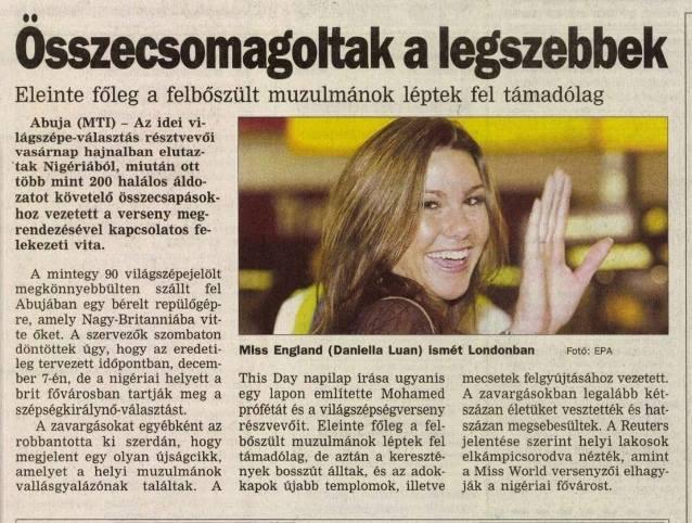 * MISS HUNGARY WORLD.- Miss Renata Rosz, 21, won the crown of ‘Miss Hungary World 2002’ on Monday, August 19. The runner-ups were Zsuzsanna Laky and Veronika Orban.