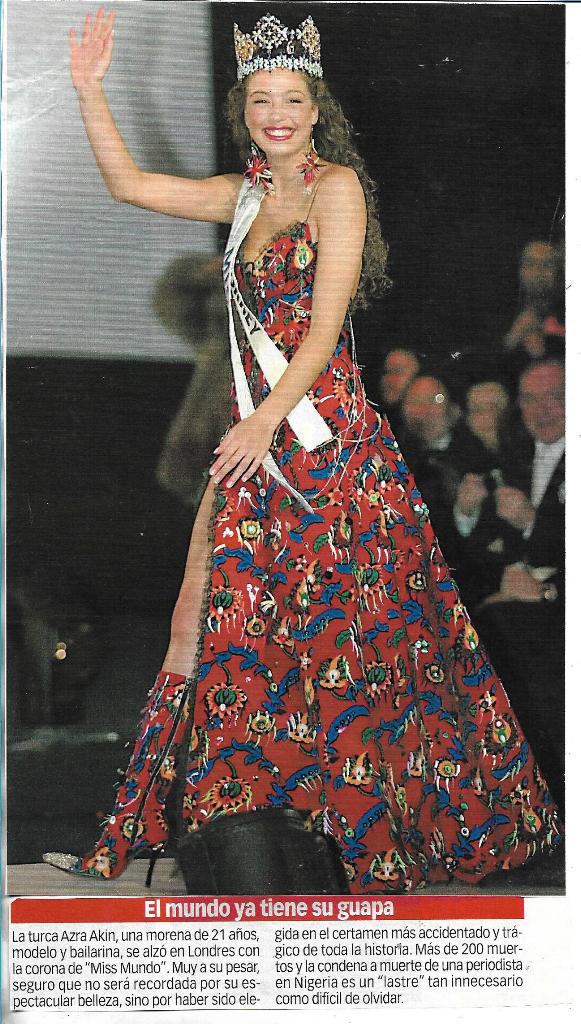 * MISS TURKEY.- On Thursday, March 14, the ‘Miss Turkey 2002’ contest was held at the ‘Lütfi Kırdar Convention and Exhibition Center’ in Istanbul with 20 girls and the musical participation of the Colombian singer Shakira. The winner was Azra Akin, 20, heading to Miss World. The runner-ups were Cagla Kubat (for Miss Universe), Esra Eron (for Miss Europe), Nihan Akkus (for Miss International) and Melikke Akkaya.